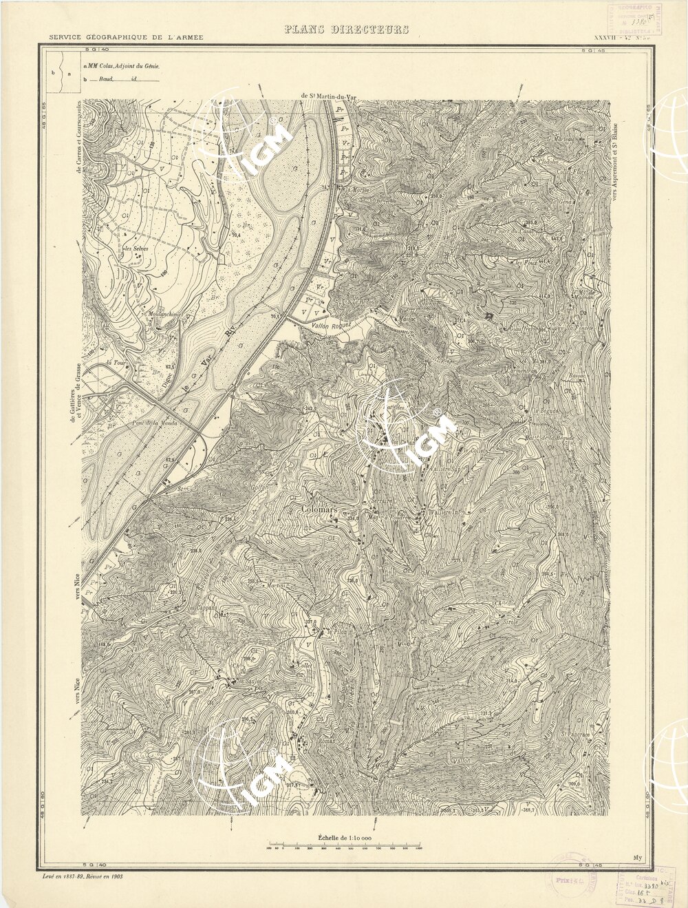 Paris. – Service Géographique de l’Arme 1914-1918. – Questi piani sono stati allestiti durante la guerra mondiale da i “Groupes de Canevas de Tir aux Armées”. Su di essi venivano riportate le sistemazioni difensive amiche e nemiche e le varie opere militari. Nelle regioni in cui esistevano le carte alla scala 1:10.000, provenienti da rilievi diretti, queste costituivano la base dei plans directeurs, mentre altrove essi erano dedotti dai piani catastali al 10.000 inquadrati nelle reti dei punti trigonometrici, introducendo per la rappresentazione dell’orografia le linee di livello ricavate dall’ingrandimento dei rilevamenti alla scala 1:40.000. Poichè con tale sistema non si aveva una esatta rappresentazione del terreno, a cura dei “Groupes de Canevas de Tir” fu provveduto, in molte zone, all’esecuzione dei rilievi regolari alla scala 1:10.000. Di tali piani esistono diverse edizioni con formato variabile: una edizione in nero con orografia rappresentata a curve di livello all’equidistanza di m.5 con quadrettatura chilometrica-sistema Lambert; altre edizioni: in nero con curve di livello in bistro, e policrome, sono senza quadrettatura.