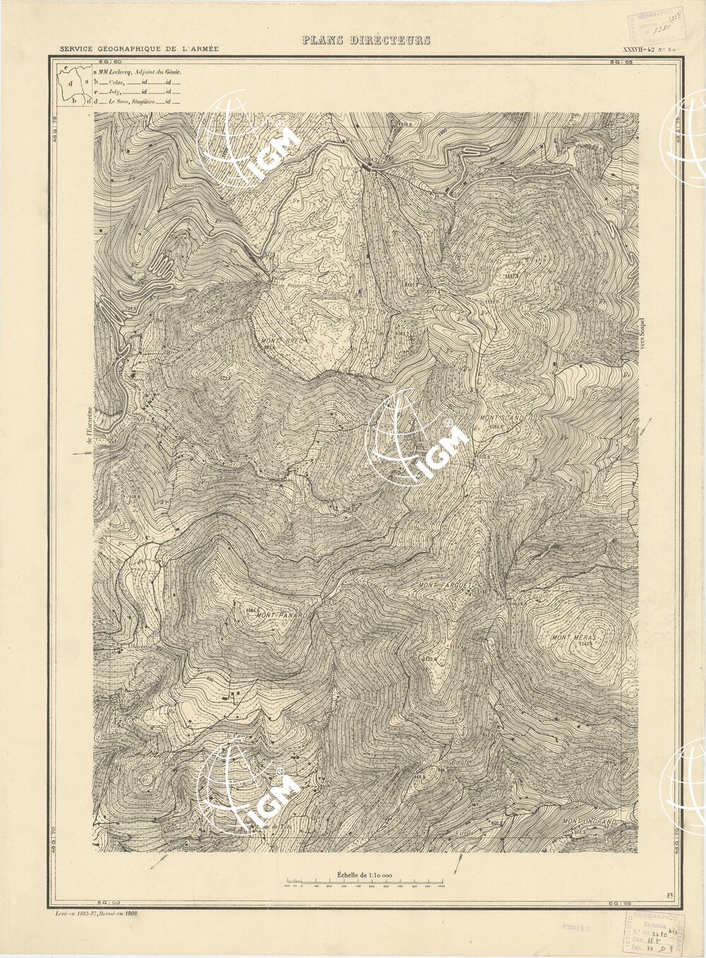 Paris. – Service Géographique de l'Arme 1914-1918. – Questi piani sono stati allestiti durante la guerra mondiale da i "Groupes de Canevas de Tir aux Armées". Su di essi venivano riportate le sistemazioni difensive amiche e nemiche e le varie opere militari. Nelle regioni in cui esistevano le carte alla scala 1:10.000, provenienti da rilievi diretti, queste costituivano la base dei plans directeurs, mentre altrove essi erano dedotti dai piani catastali al 10.000 inquadrati nelle reti dei punti trigonometrici, introducendo per la rappresentazione dell'orografia le linee di livello ricavate dall'ingrandimento dei rilevamenti alla scala 1:40.000. Poichè con tale sistema non si aveva una esatta rappresentazione del terreno, a cura dei "Groupes de Canevas de Tir" fu provveduto, in molte zone, all'esecuzione dei rilievi regolari alla scala 1:10.000. Di tali piani esistono diverse edizioni con formato variabile: una edizione in nero con orografia rappresentata a curve di livello all'equidistanza di m.5 con quadrettatura chilometrica-sistema Lambert; altre edizioni: in nero con curve di livello in bistro, e policrome, sono senza quadrettatura.