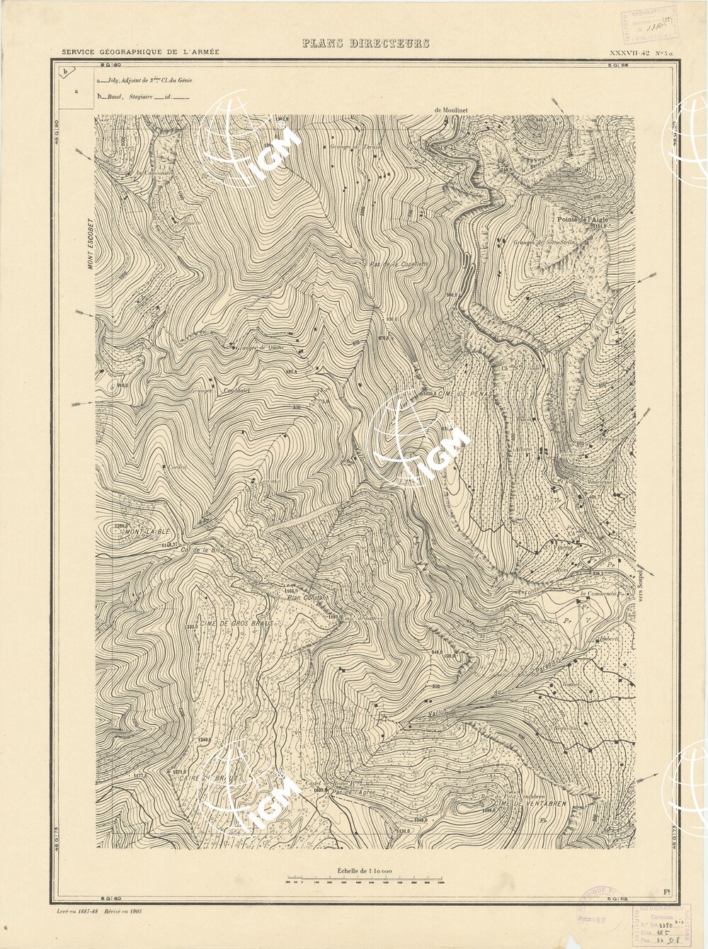 Paris. – Service Géographique de l'Arme 1914-1918. – Questi piani sono stati allestiti durante la guerra mondiale da i "Groupes de Canevas de Tir aux Armées". Su di essi venivano riportate le sistemazioni difensive amiche e nemiche e le varie opere militari. Nelle regioni in cui esistevano le carte alla scala 1:10.000, provenienti da rilievi diretti, queste costituivano la base dei plans directeurs, mentre altrove essi erano dedotti dai piani catastali al 10.000 inquadrati nelle reti dei punti trigonometrici, introducendo per la rappresentazione dell'orografia le linee di livello ricavate dall'ingrandimento dei rilevamenti alla scala 1:40.000. Poichè con tale sistema non si aveva una esatta rappresentazione del terreno, a cura dei "Groupes de Canevas de Tir" fu provveduto, in molte zone, all'esecuzione dei rilievi regolari alla scala 1:10.000. Di tali piani esistono diverse edizioni con formato variabile: una edizione in nero con orografia rappresentata a curve di livello all'equidistanza di m.5 con quadrettatura chilometrica-sistema Lambert; altre edizioni: in nero con curve di livello in bistro, e policrome, sono senza quadrettatura.