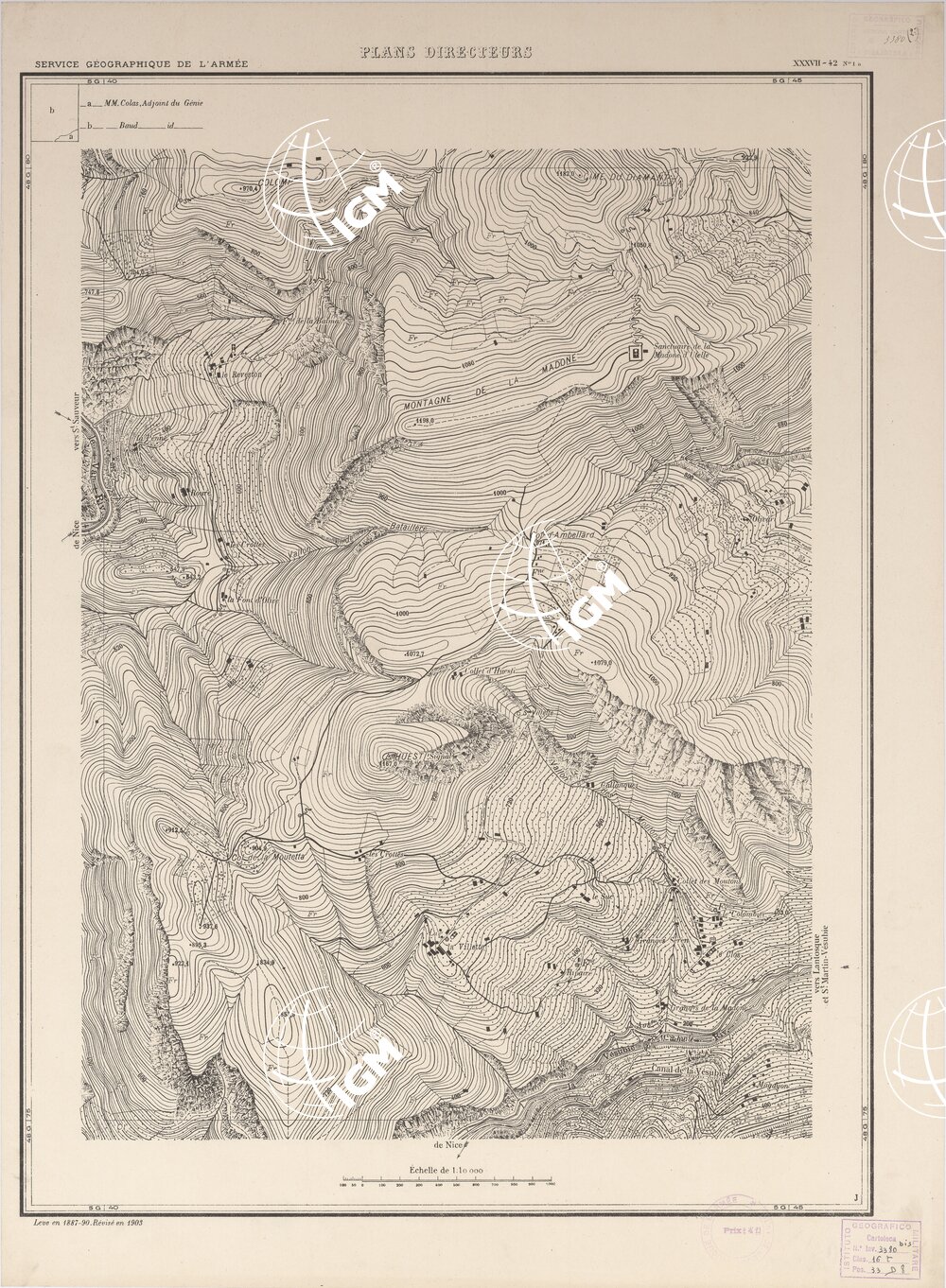 Paris. – Service Géographique de l'Arme 1914-1918. – Questi piani sono stati allestiti durante la guerra mondiale da i "Groupes de Canevas de Tir aux Armées". Su di essi venivano riportate le sistemazioni difensive amiche e nemiche e le varie opere militari. Nelle regioni in cui esistevano le carte alla scala 1:10.000, provenienti da rilievi diretti, queste costituivano la base dei plans directeurs, mentre altrove essi erano dedotti dai piani catastali al 10.000 inquadrati nelle reti dei puntio trigonometrici, introducendo per la rappresentazione dell'orografia le linee di livello ricavate dall'ingrandimento dei rilevamenti alla scala 1:40.000. Poichè con tale sistema non si aveva una esatta rappresentazione del terreno, a cura dei "Groupes de Canevas de Tir" fu provveduto, in molte zone, all'esecuzione dei rilievi regolari alla scala 1:10.000. Di tali piani esistono diverse edizioni con formato variabile: una edizione in nero con orografia rappresentata a curve di livello all'equidistanza di m.5 con quadrettatura chilometrica-sistema Lambert; altre edizioni: in nero con curve di livello in bistro, e policrome, sono senza quadrettatura.
