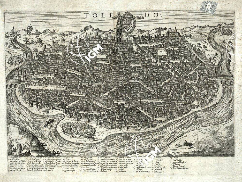 Pianta della città di Toledo con l’indicazione delle località e monumenti principali. Autore Matteo Florini formò in Siena. Incisione su rame. Rappresentazione orografica prospettica. Grafia in lingua Spagnola.