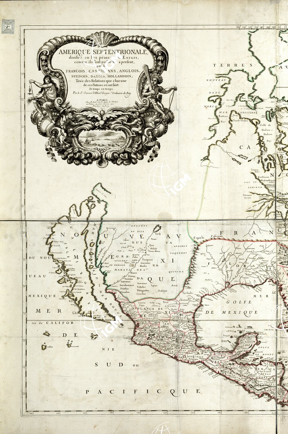 Divisée en ses principaux Estats, comme ils sont possedes a present, par les François Castillans, Anglois, Svedois, Danois, Hollandois, Tirée des relations que chacune de ces Nations en ont faict de temps en temps, par le S. Sanson d’Abbevs Geogra. Ordinaire du Roy. A Paris chez Robert, ecc., 1715. Grande carta incisa su rame da “D. Lapointe fe” E’ in quattro fogli riuniti. Limii: nord, les 3 isles; sud, Gol. de Panama; est Isles Açores; ovest, Calieornie isle. Il reticolato presenta notevoli differenze fra le suddivisioni dei gradi nei lati est e ovest della carta; poca precisione è anche nelle scale grafiche. L’orografia è rappresentata a volo d’uccello: la toponomastica è prevalentemente in francese con nomi tedeschi e spagnoli.