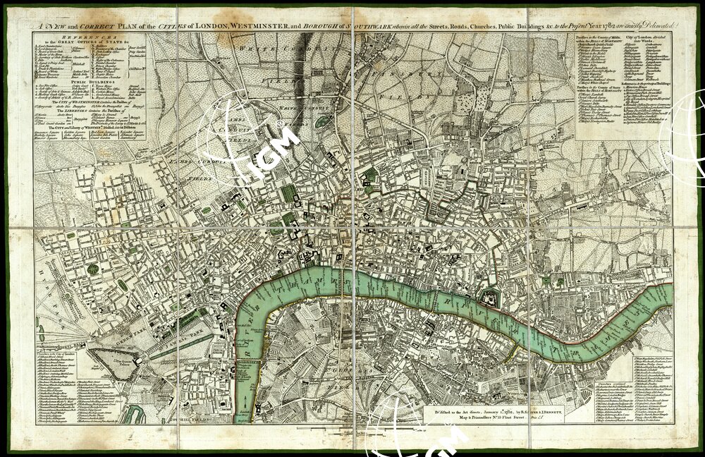 Westminster and borough og Southwark wherein all the Streets, Roads, Churches, Public Buildings, etc. to the present Year 1782 are exactly delineated. Published as the Act directs, January I, 1782, by R. Sayer and J. Bennet. Map and Printsellers n.53 Flect Strect. Price I S. Questo nuovo piano di Londra, di Westminster e dei borghi situati a sud, comprende tutte le vie rotabili, chiese, pubblici edifici esistenti nel 1782. Venne pubblicato dall’autore R. Sayer e Bennett. E’ Inciso su rame in un foglio unico, montato su tela a stacchi, ed è collocato in busta. Contiene scale grafiche, una è in furlong, l’altra è di Yards.