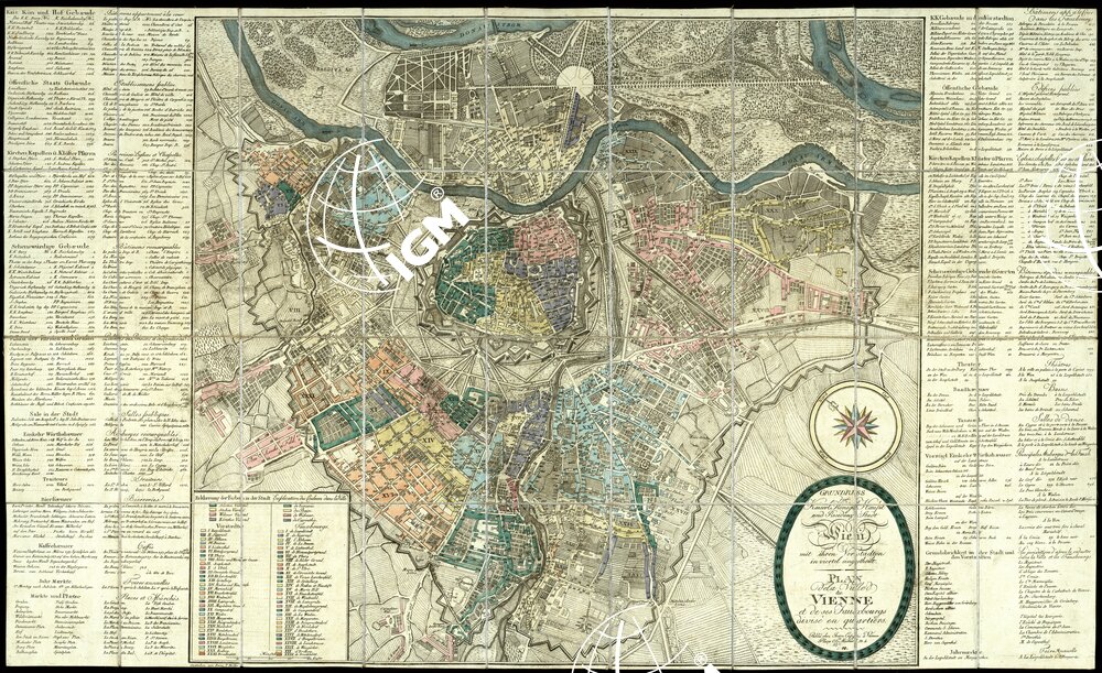 Et de ses Fauxbourgs divise en Quartiers. Publié chez Jean Cappi à Vienne-Place St. Michel N .4, 1811. Scala grafica di 400 Klafter che misura 75 mm., il rapporto è di 1:10.000 circa. Incisione in rame in un solo foglio. E’ montata su tela a stacchi. Con colori sono distinti i vari quartieri. Orientamento: nord inclinato verso ovest.