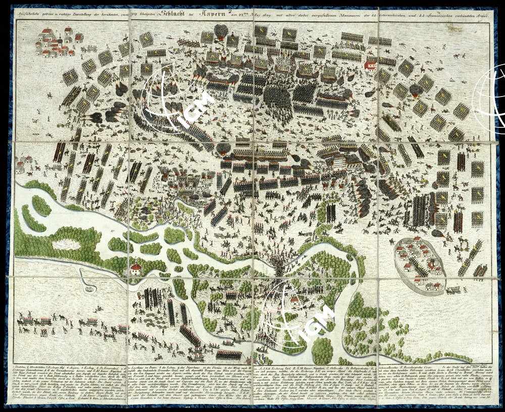 und richtige Dartstellung der beruhmten zweitagig blutigen Schlacht bei Aspernam 21 ten Maj 1809 mit allen Vorgefallenen Angriffen der K.K. franzosischen Verbundeten Armèe. Carta in due fogli separatemente montati su tela e colorati a mano sull’incisione in rame. Rappresentano fedelmente ed esaurientemente la celebre sanguinosa battaglia di “Aspern” durata due giorni. Il foglio N.1 rappresenta la giornata 21 marzo 1809, e descrive tutti gli attacchi dell’esercito austro-ungarico e degli eserciti associati francesi. Il foglio N. 2 descrive la seguente giornata del 22 maggio 1809.