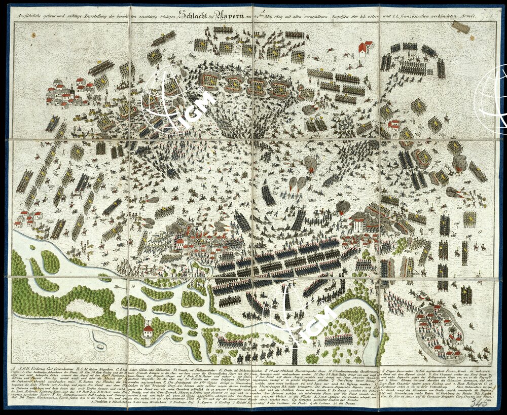 Und richtige Darstellung der beruhmten zweitagig blutigen Sclacht bei Aspernam 21 ten Maj 1809 mit allen Vorgefallenen Angriffen der K.K. oster und K:K: franzosischen Verbundeten Armèe. Carta in due fogli separatmente montati su tela e colorati a mano sull’incisione in rame. Rappresentano fedelmente ed esaurientemente la celebre sanguinosa battaglia di “Aspern” durata due giorni. Il foglio n°1 rappresenta la giornata 21 marzo 1809, e descrive tutti gli attacchi dell’esercito austro-ungarico e degli eserciti associati francesi. Il foglio N. 2 descrive la seguente giornata del 22 maggio 1809.
