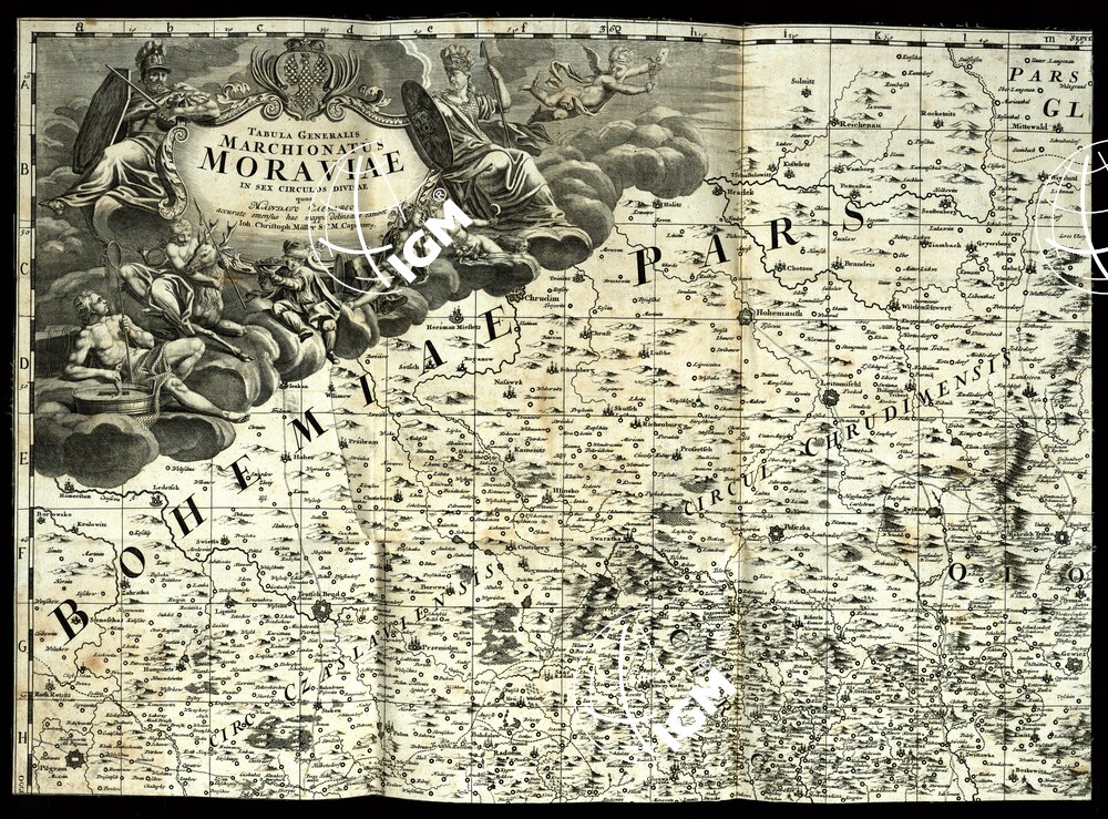 In sex Circulos disaequos mandato Caesarco – accurata emensus hac mappa delineatos exibet – Joh Christoph Muller S.C.M. Capitane. Scala grafica di 4 miglia di Moravia con il rapporto approssiamtivo di 1:185.000. La carta è incisa in rame in 4 fogli staccati, ciascuno è montata su tela. Il titolo è situato nell’angolo nord-ovest del foglio superiore a sinistra, ed è contornato da artistica allegoria. Contiene le strade principali, gli abitati, l’idrografia, i confini, l’orografia rappresentata a volo d’uccello e le foreste.