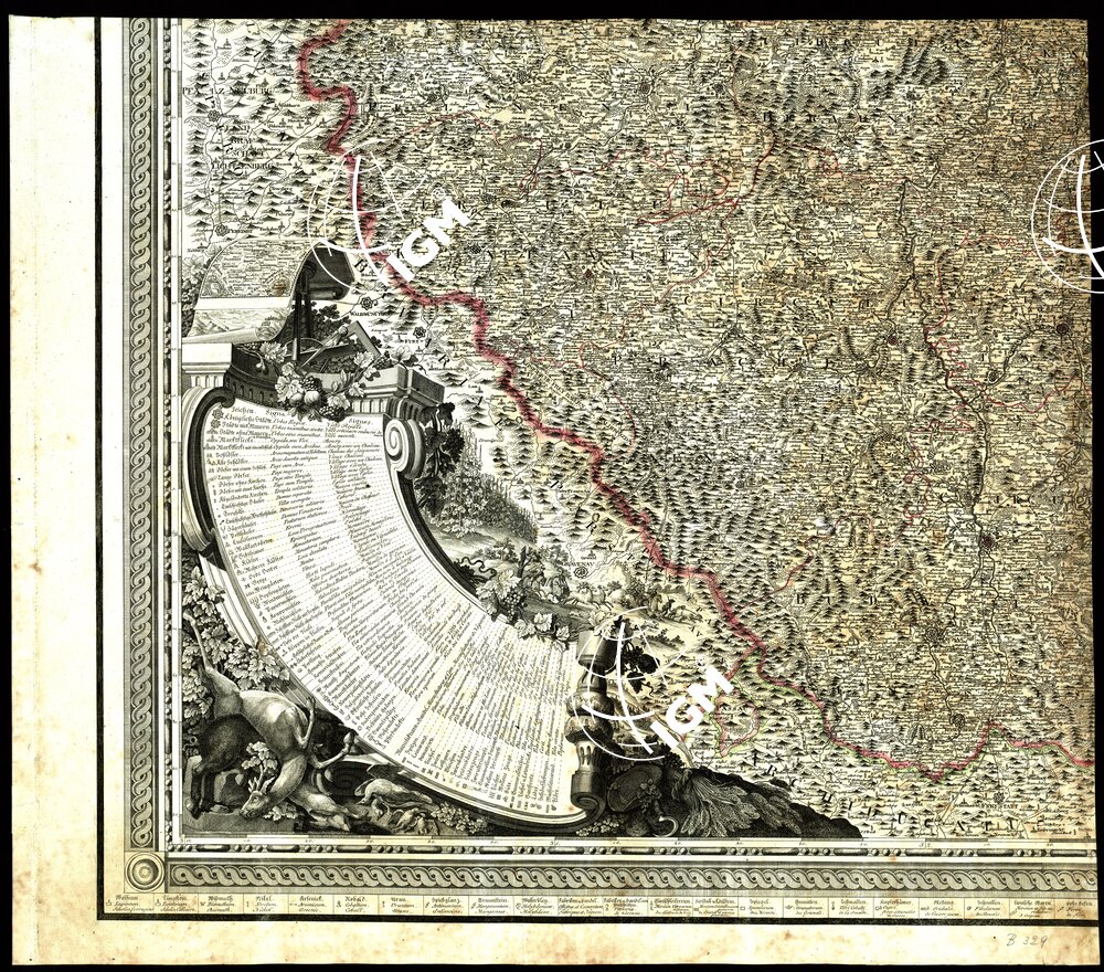 rapporto è di 1:344.560 circa. Carta incisa in rame in 4 fogli riuniti, dedicata a Carlo Ludovico Arciduca d’Austria. Ricca cornice trovasi
