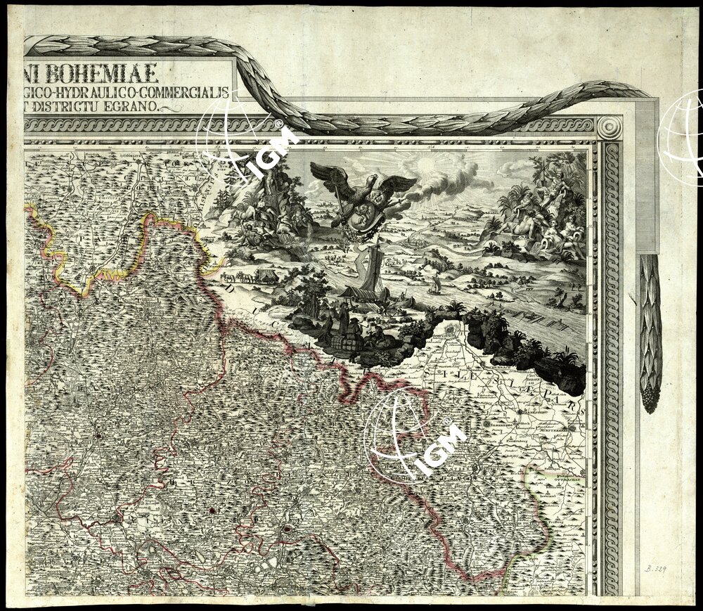 rapporto è di 1:344.560 circa. Carta incisa in rame in 4 fogli riuniti, dedicata a Carlo Ludovico Arciduca d’Austria. Ricca cornice trovasi
