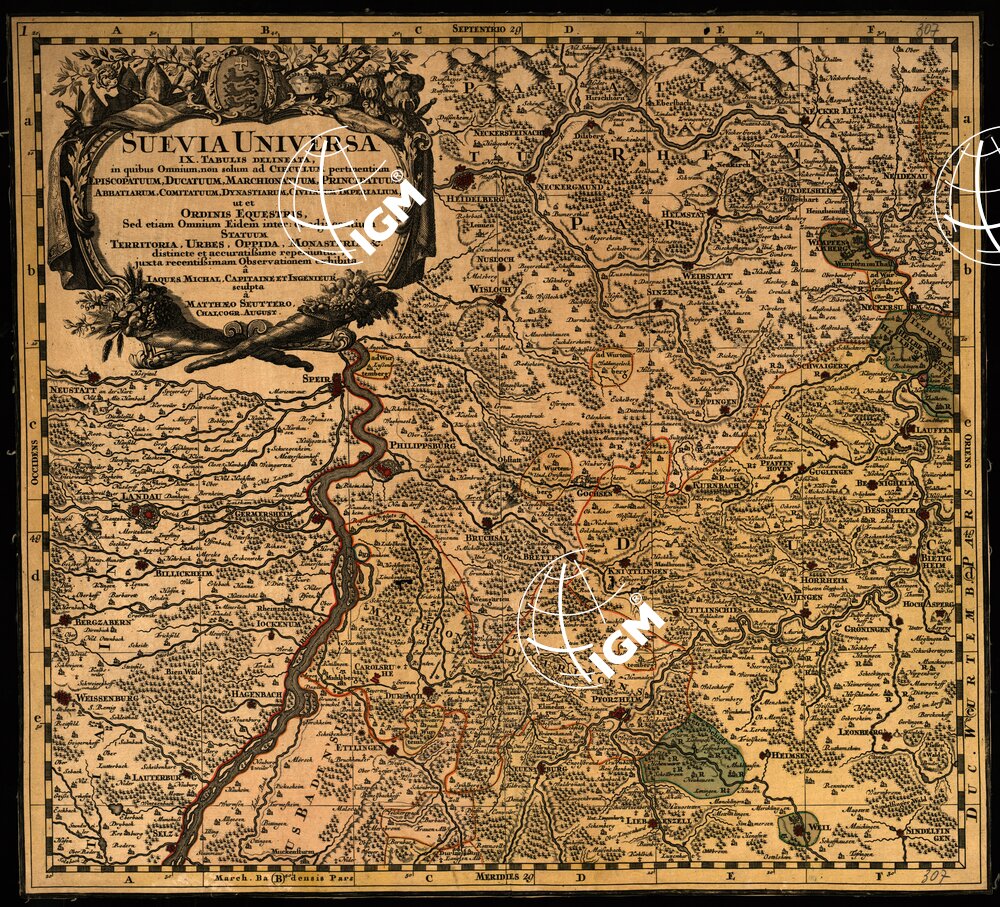 ovest. La carta è stata incisa su rame fra la fine del 1600 ed il principio del 1700, da Matthaeo Seuttero nella Calcografia di Augusta; ne è