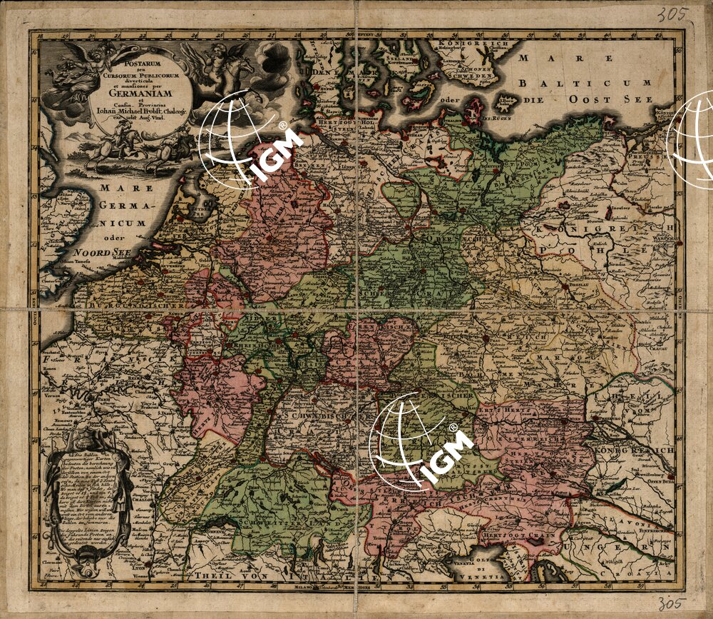 Provincias-Iohan Michael Probts, Chalcogr. Exc Udit Vind. Un grado di meridiano è lungo mm. 30, ne risulta che il rapporto è di 1:3.700.000. Incisione su rame molto confusa, è un foglio unico rappresentante le vie postali della Germania. I vari stati distinti con coloritura diversa. I paesi più importanti sono segnati con minio. Le longitudini provengano dalle isole Azzorre (gruppo est). La copia posseduta è montata su tela a stacchi.