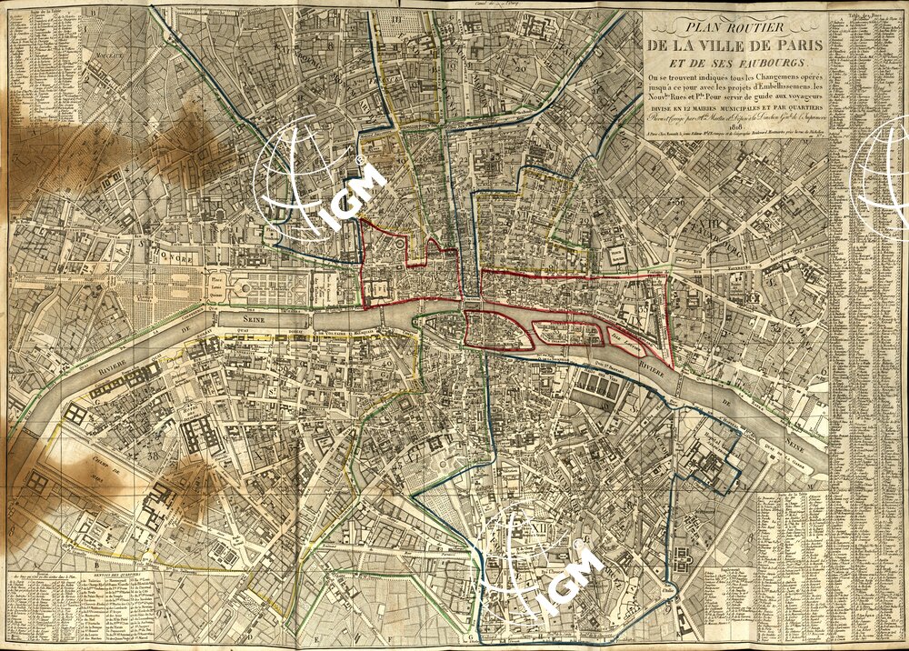 Plan routier de la ville de Paris et de ses faubourgs. – Ou se trouvent tous les Changemens opéré jusqu’a ce jour avec les projets d’embellissemens les nouvelles rous et pour servir de guide aux voyageurs; divisé en 12 mairies municipales et par quartiers, revu et corigé par A. Martin 1818 a Paris chez Esnault le jeune, editeur ecc. Boulevard Montmatre près la rue de Richelieu au n. 7. Come la precedente, rappresenta la pianta della città di Parigi. Proviene da incisione su rame ed è stampata in nero. I limiti amministrativi sono acquerellati a varie tinte. La leggenda dei nomi è posta ai margini del foglio. Da confronti fatti risulta che il rapporto è di 1 a 9.350 circa.