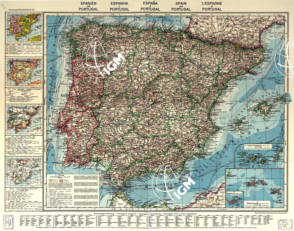 Autore Georg Wsterman. Editore Georg Westerman – Braunschrweig – Berlin – Hamburg. Stampa in policromia. Rappresentazione orografica a tratteggio dimostrativo. Grafia il lingua Spagnola-Portoghese-Tedesco-Inglese-Francese.