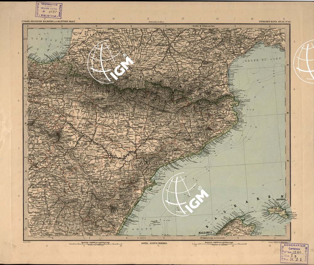Gotha. – C. Vogel, 1871. E’ una carta politica facente parte dello “Stielers Hand-Atlas” di Justus Pethers. E’ stampata in color nero da finissima incisione su rame. Sono coloriti a mano i confini amministrativi e politici. L’orografia è rappresentata da tratteggio a lumeggiamento obliquo. Si compone di 4 fogli.