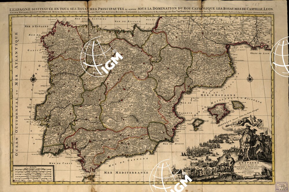 Distinguée on tous ses Royaumes, Principautés etc scavoir sous la domination du Roy Catholique les Royaumes de Castille, Leon Gallice, Navarre, Andalousie, Grenade, Murcie, Aragon, Valence et Majorque et les Printes des Asturies, Biscaye et Catalogne. Sous la domination du Roy de Prtugal, les Roymes de Portugal et d’Algarve. Tiré de plusieurs memoires les plus recents. Dresseez sur les degréez de M N. Sanson, a Amsterdam par Corens et Mortier (senza data). Foglio unico, stampato in nero da incisione su rame; i confini amministrativi e politici ed i centri abitati di maggiore importanza sono colorati a mano. Sono poste in evidenza le vie di comunicazione principali mediante doppio tratto, le zone boscose con gruppi di alberelli. L’orografia è rappresentata prospetticamente da serie di coni ombreggiati a lumeggiamento obliquo. La longitudine è segnata a partire dal merdiano dell’isola del Ferro. E’ stato costruito nella seconda metà del secolo XVII e pubblicato da J. Cçvens et Corneille Mortier. Delineazione e incisione sono opera di Joan Luchtenburch.