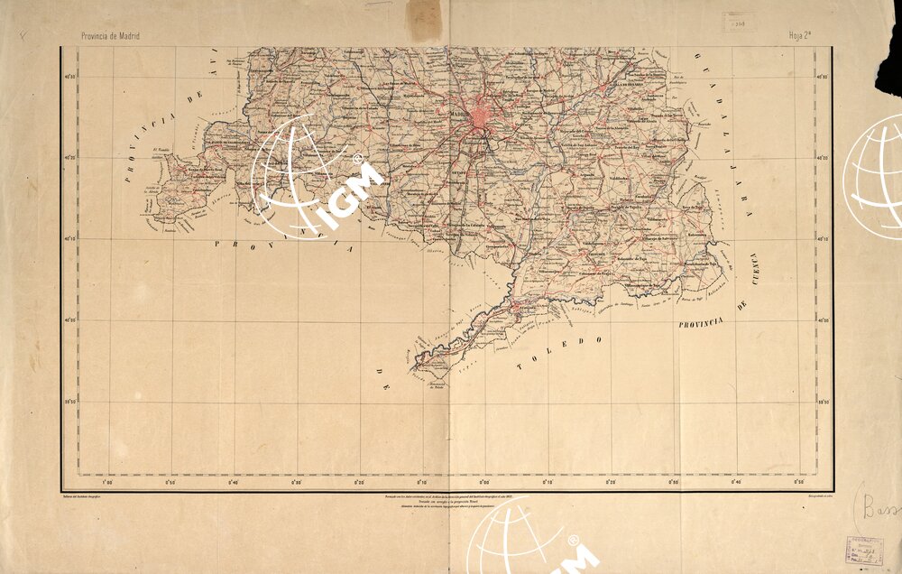 Madrid. – Istituto Geografico y Estadistico. Si compone di due fogli. Il campo disegnato occupa solamente il centro dei fogli, il rimanente spazio è coperto da indicazioni varie. Il sistema di proiezione adottato è quello di Tissot. E’ stampata in edizione policroma da fotoincisione in rame. L’orografia è rappresentata da curve di livello in bistro contrassegnate da quote (equidistanza m.100); i centri abitati e le strade principali sono in color rosso; le ferrovie, le scritture ed i confini amministrativi in nero; le acque in azzurro. E’ una carta amministrativa.