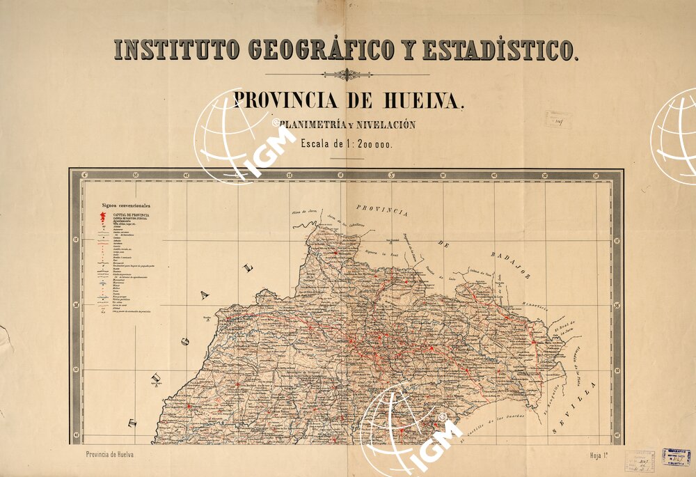 Madrid. – Istituto Geografico y Estatistico. Si compone di due fogli. Il campo disegnato non occupa interamente tale spazio, ma è limitato al centro del fogli. E’ compilata in edizione policroma da fotoincisione in rame. L’orografia è rappresentata da curve altimetriche in color bistro e contrassegante da quote (Equidistanza m.100); i centri abitati e le strade principali sono incolor rosso; l’idrografia in azzurro; le ferrovie, i confini amministrativi e le scritture sono in nero. Il sistema di proiezione adottato è quello di Tissot. Da un’annotazione posta la margine inferiore del 2 foglio risulta che l’altimetria è stata dedotta dalle osservazioni barometriche della carta 1:1.000.000. E’ una carta amministrativa.