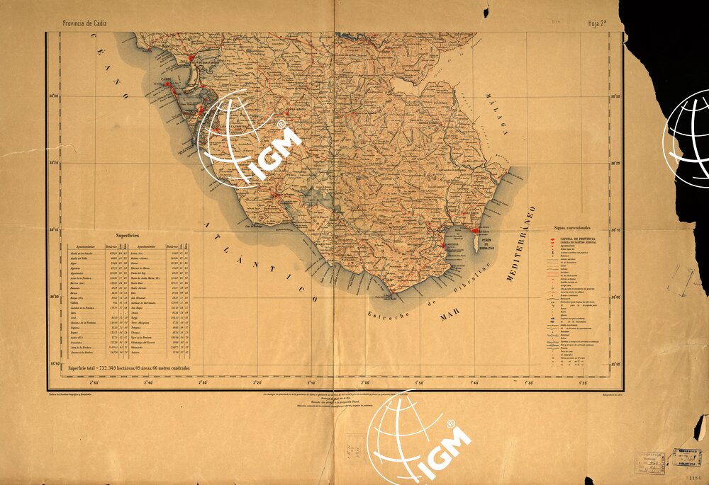 Madrid. – Istituto Geografico y Estadistico. Si compone di due fogli in edizione policroma. Dall’annotazione posta al margine inferiore del 1° foglio risulta che i lavori relativi alla parte planimetrica si effetuarono nel periodo 1872-1874, ma la carta fu completata fra il 1905 ed il 1912. L’orografia è rappresentata da curve altimetriche in color bistro contrassegnate da quote (equidistanza m.100); le acque in color azzurro; le strade principali e i centri abitati in rosso; le ferrovie, le scritture ed il rimanente delle strade sono in color nero. L’altimetria risulta dedotta dalla livellazione topografica. Il sistema di proiezione adottato è quello di Tissot. E’ una carta amministrativa.