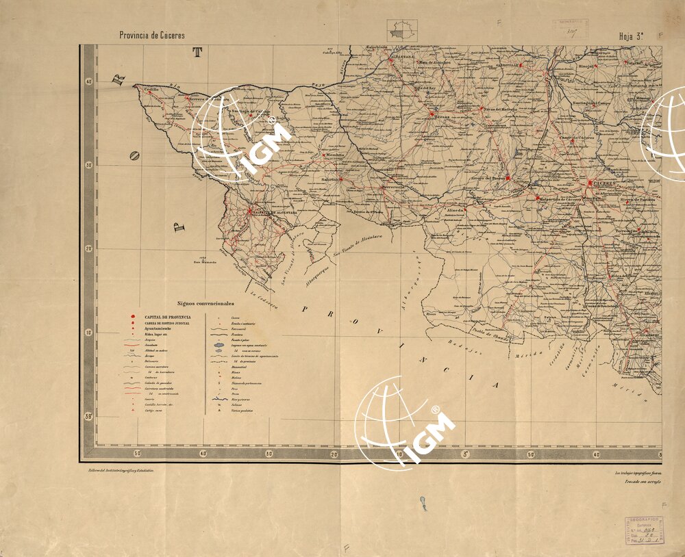 Madrid. – Istituto Geografico y Estadistico. Si compone di due fogli in edizione policroma. Dall'annotazione posta al margine inferiore del 1° foglio risulta che i lavori relativi alla parte planimetrica si effetuarono nel periodo 1872-1874, ma la carta fu completata fra il 1905 ed il 1912. L'orografia è rappresentata da curve altimetriche in color bistro contrassegnate da quote (equidistanza m.100); le acque in color azzurro; le strade principali e i centri abitati in rosso; le ferrovie, le scritture ed il rimanente delle strade sono in color nero. L'altimetria risulta dedotta dalla livellazione topografica. Il sistema di proiezione adottato è quello di Tissot. E' una carta amministrativa.
