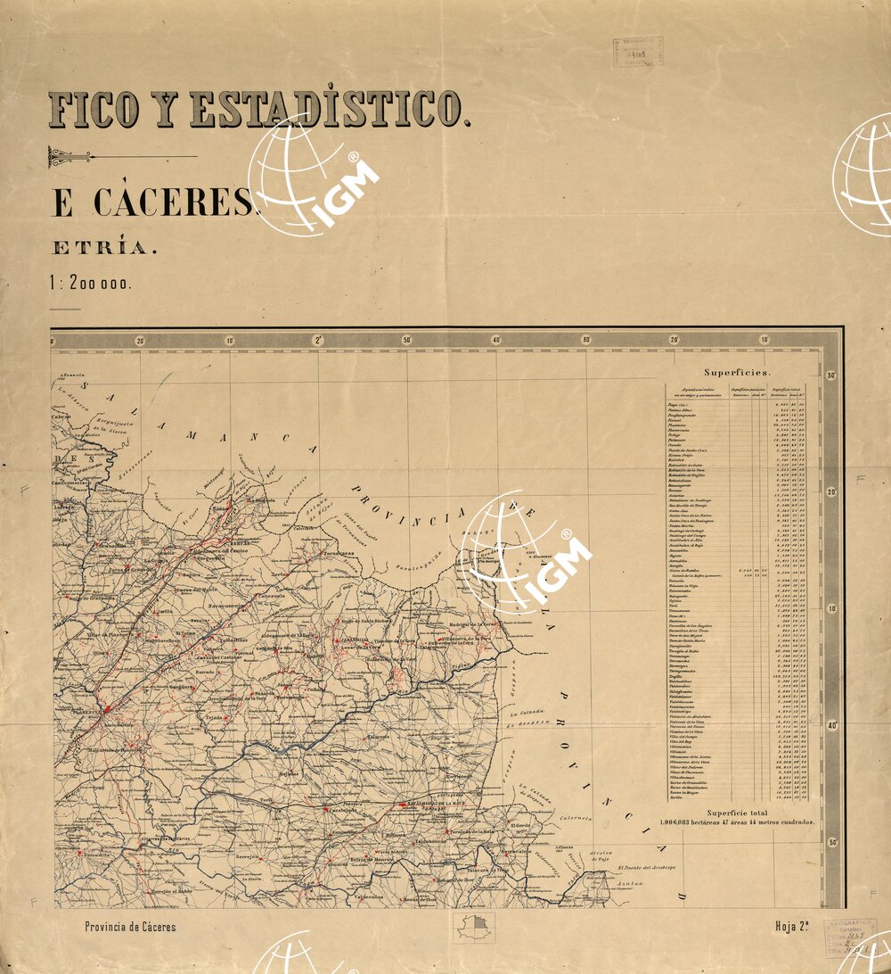 Madrid. – Istituto Geografico y Estadistico. Si compone di due fogli in edizione policroma. Dall'annotazione posta al margine inferiore del 1° foglio risulta che i lavori relativi alla parte planimetrica si effetuarono nel periodo 1872-1874, ma la carta fu completata fra il 1905 ed il 1912. L'orografia è rappresentata da curve altimetriche in color bistro contrassegnate da quote (equidistanza m.100); le acque in color azzurro; le strade principali e i centri abitati in rosso; le ferrovie, le scritture ed il rimanente delle strade sono in color nero. L'altimetria risulta dedotta dalla livellazione topografica. Il sistema di proiezione adottato è quello di Tissot. E' una carta amministrativa.