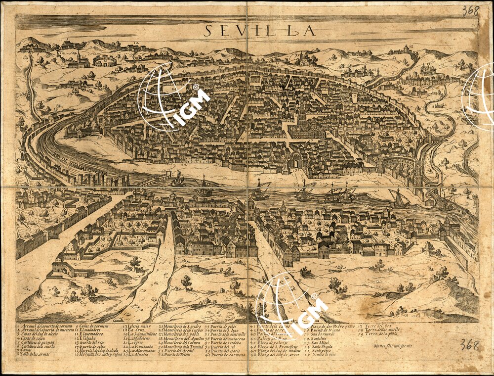 E’ una pianta della città di Siviglia, rappresentata prospetticamente in foglio unico, montato su tela a stacchi. Non presenta alcuna indicazione circa la località e l’epoca in cui è stata pubblicata; si ritiene però che sia del sec XVI. E’ stampata in nero da incsione su rame.