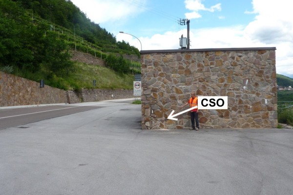 [{"simbolo_contrassegno":"B1","materializzazione":"(CSO) – Bullone infisso sulla facciata laterale destra, rivestita in pietra, della cabina ENEL presso lo spigolo sinistro."}]