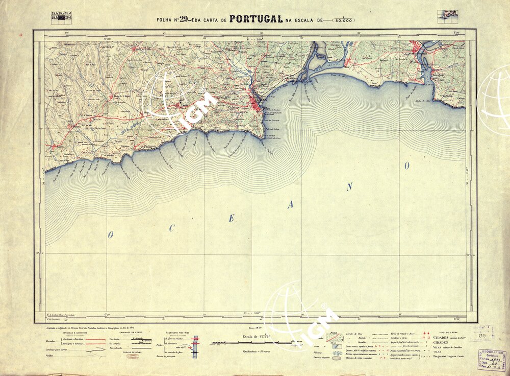 Direcçao Geral dos Trabalhos Geodèsicos e Topograficos Lisboa. Stampa in policroma a curve di livello.