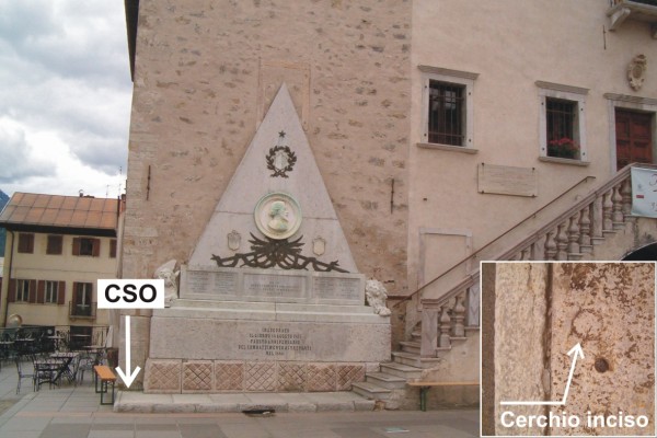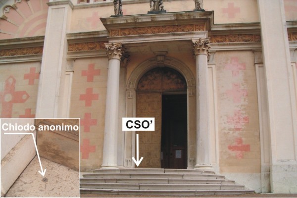 | Contrassegni | [{"simbolo_contrassegno":"B3","materializzazione":"(CSO) – Circolo inciso infisso presso lo spigolo di sinistra dell'ex palazzo municipale, presso la lapide commemorativa di Pier Fortunato Calvi."},{"simbolo_contrassegno":"B2","materializzazione":"(CSO') – Chiodo anonimo infisso sulla soglia a sinistra, entrando nella Chiesa parrocchiale."}] |