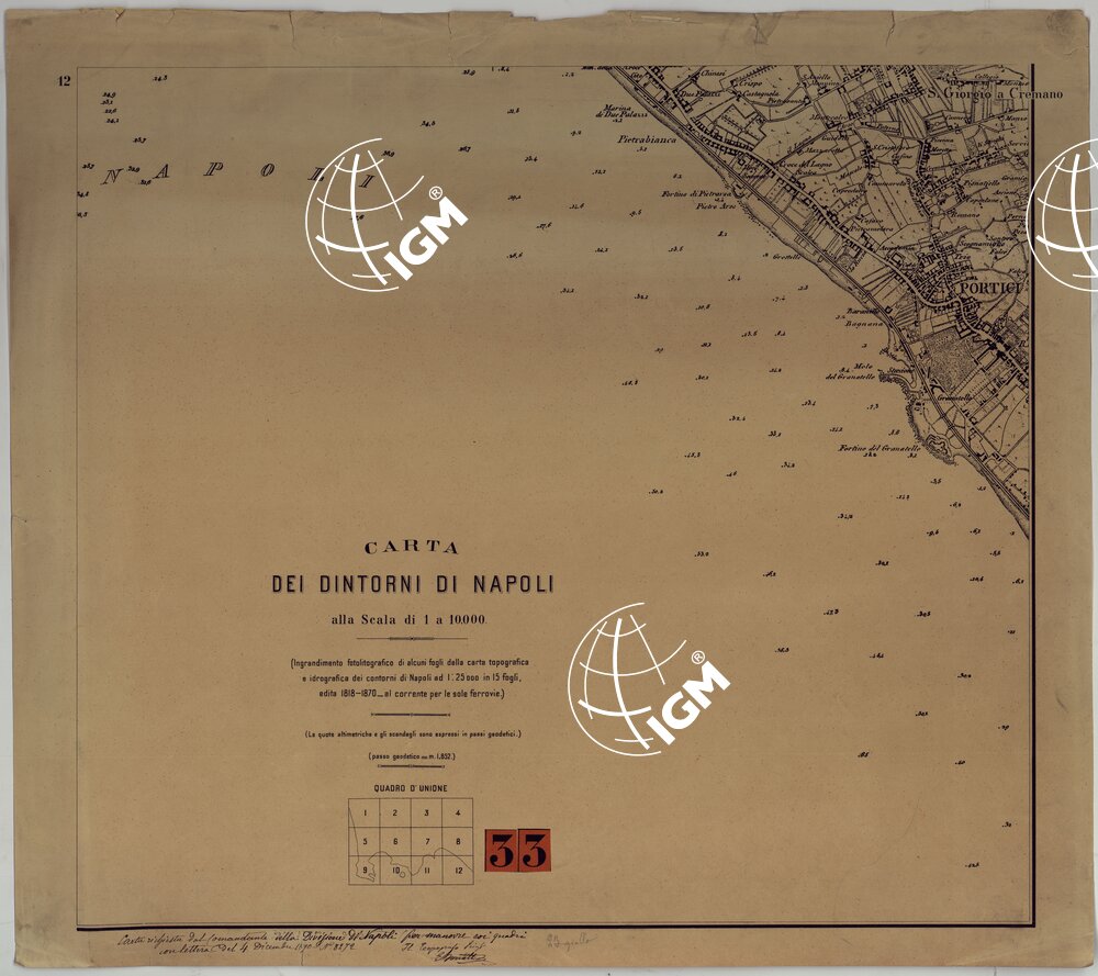 Ingrandimento fotolitografico di alcuni fogli della carta topografica e idrografica dei contorni di Napoli ad 1:25,000 in 15 fogli, edita nel 1818-1870 al corrente per le sole ferrovie. Le quote altimetriche e gli scandagli sono espressi in passi geodetici. Passo geodetico= M.1,852.Documento formato da 12 fogli piu’ una copia.