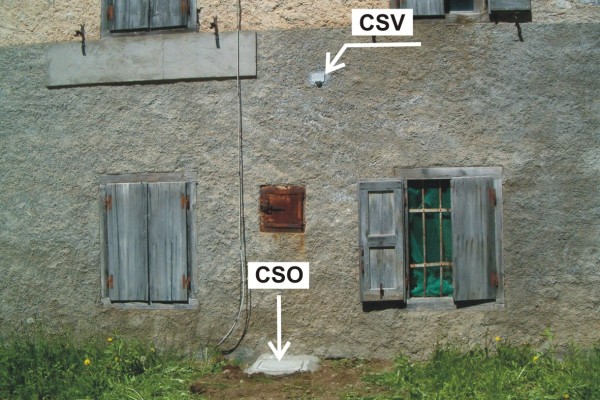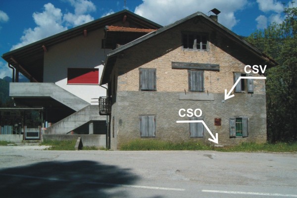 [{"simbolo_contrassegno":"P2","materializzazione":"(CSO) – Chiusino in ghisa di II categoria rialzato con pozzetto in cemento e coperchio anonimo posto a mt 5,70 dallo spigolo sinistro e a mt 2,85 dallo spigolo destro della facciata dell'edificio."},{"simbolo_contrassegno":"V1","materializzazione":"(CSV) – Mensola infissa sulla facciata dell'edificio ed in corrispondenza del cso."}]