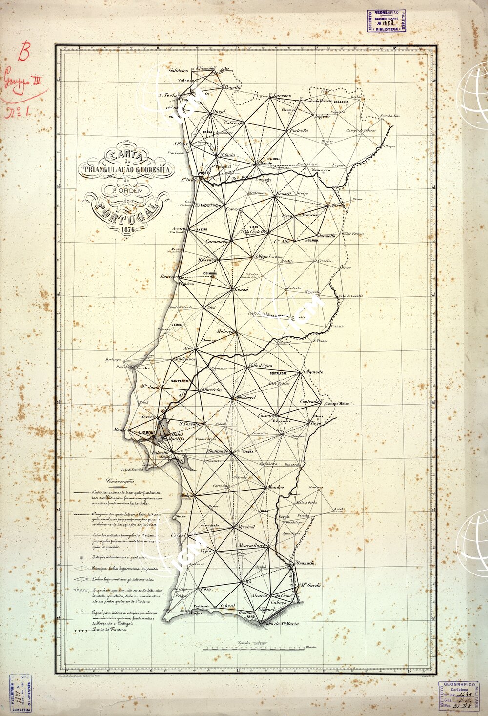 Direcçao Geral dos Trabalhos geodesicos. E’ stampata in nero da incisione su pietra. Contiene la triangolazione geodetica fondamentale che forma sistema con quella spagnola, e la triangolazione ausiliaria. Ha per origine della longitudine il meridiano di Lisbona.