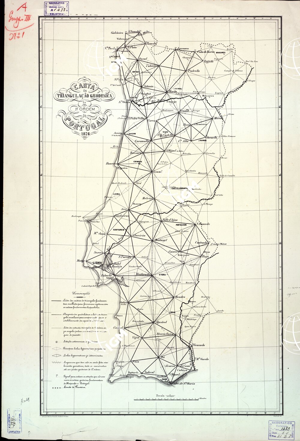 Direcçao Geral dos trabalhos geodesicos. E’ stampata in nero da incisione su pietra. Contiene la triangolazione geodetica fondamentale che forma sistema con quella spagnola, e la triangolazione ausiliaria. Ha per origine della longitudine e il meridiano di Lisbona.