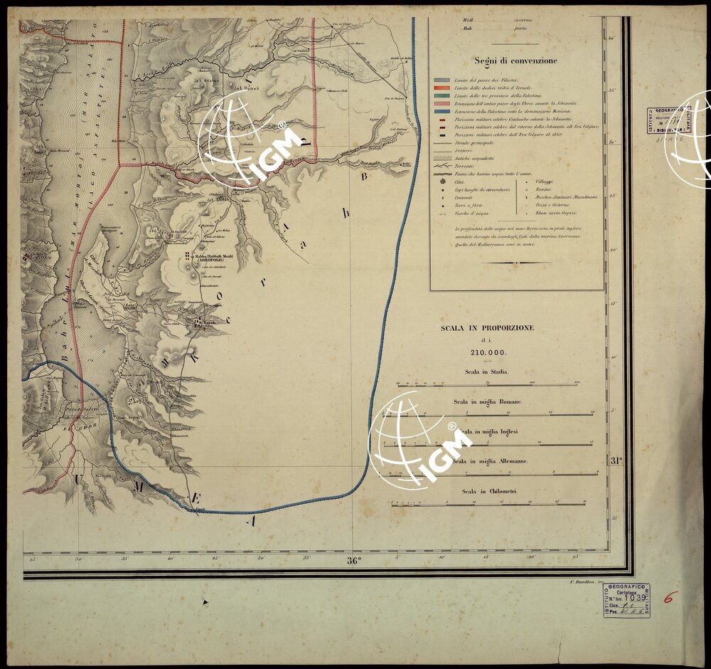 Carta con le più celebri posizioni Militari. Redatta e disegnata in nero, coloritura a mano a tratteggio nel corso di 8 anni sul Terreno stesso dal Dott. Ermete Pierotti architetto Ingegnere della Terra Santa di S.E. Soraja Pacha e membro corrispondente di varie accademie dedicata a S.M. il Re D’Italia Vittorio Emanuele II.