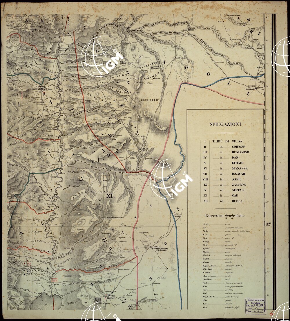 Carta con le più celebri posizioni Militari. Redatta e disegnata in nero, coloritura a mano a tratteggio nel corso di 8 anni sul Terreno stesso dal Dott. Ermete Pierotti architetto Ingegnere della Terra Santa di S.E. Soraja Pacha e menbro corrispondente di varie accademie; dedicata a S.M. il Re D’Italia Vittorio Emanuele II.