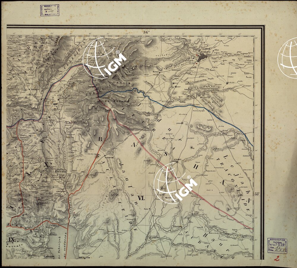 Carta con le più celebri posizioni Militari. Redatta e disegnata in nero, coliratura a mano a tratteggio nel corso di 8 anni sul Terreno stesso dal Dott. Ermete Pierotti architetto Ingegnere della Terra Santa di S.E. Soraja Pacha e menbro corrispodente di varie accademie; dedicata a S.M. il Re D’Italia Vittorio Emanuele II.