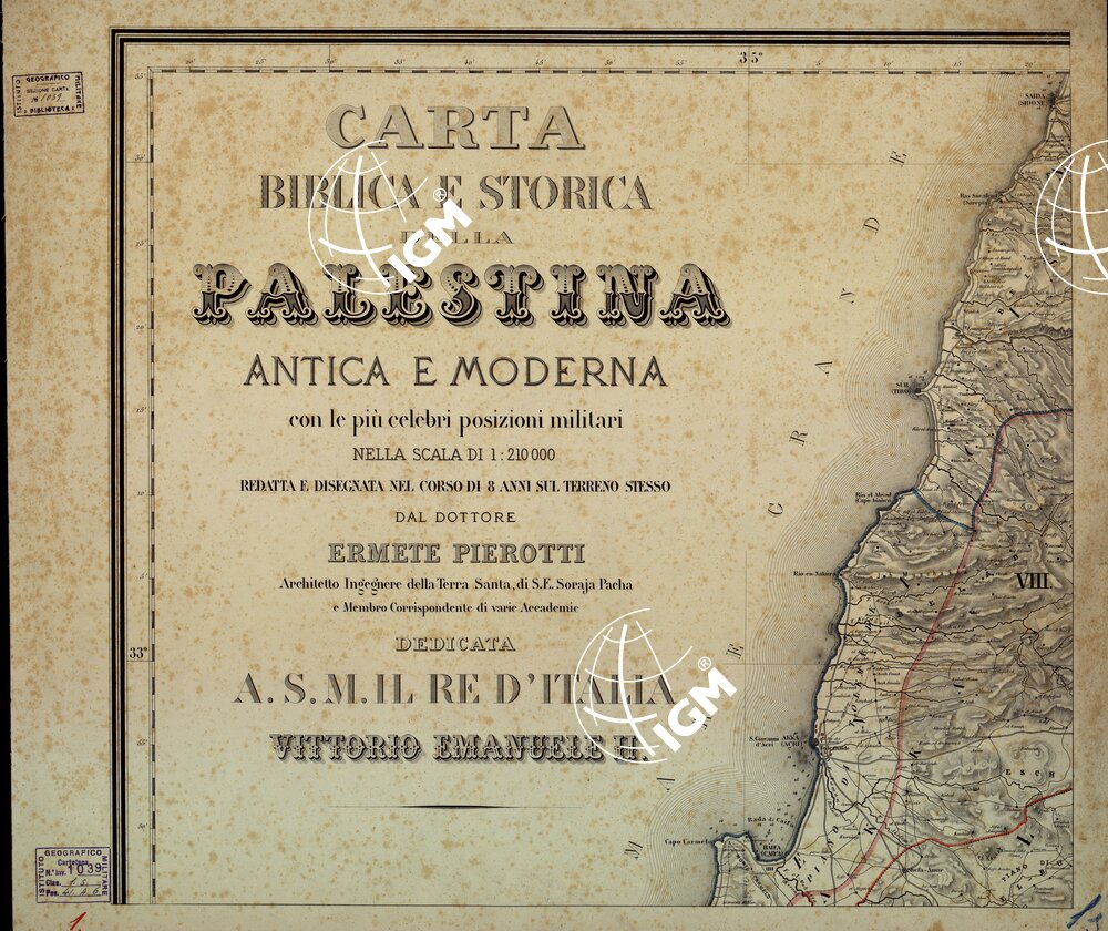 Carta con le celebri posizioni Militari. Redatta e disegnata in nero coloritura a mano a tratteggio nel corso di 8 anni sul Terreno stesso dal Dott. Ermete Pierotti architetto Ingegnere della Terra Santa di S.E. Soraja Pacha e membro corrispondente di varie accademie; dedicata a S.M. il Re D’Italia Vittorio Emanuele II
