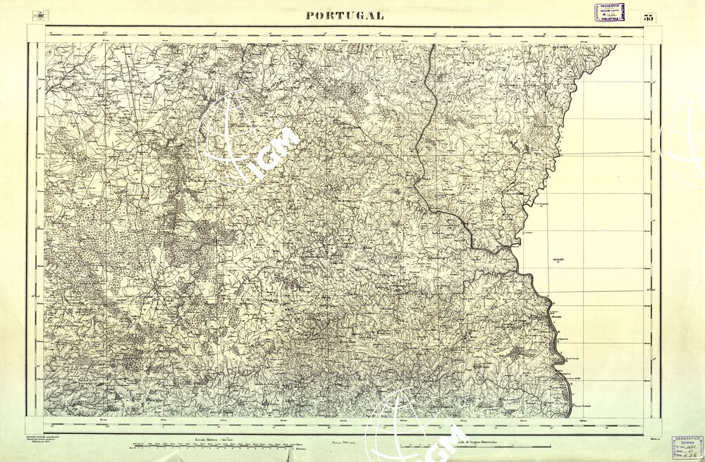 La carta si compone di 37 fogli; corrispondenti ad un’estensione di circa 4000 Kmq. Il rilievo del terreno per la sua compilazione fu dapprima eseguito alla scala di 1:100.000; in seguito per le regioni più popolate fu fatto al 50 mila. E’ stampata in nero da incisione in pietra. La configurazione del suolo era dapprima rappresentata col solo tratteggio, in seguito fu adottato per tutti i fogli il sistema delle curve di livello con equidistanza di 25 metri, sussidiato da quote altimetriche. Le curve sono molto sottili, è difficile quindi afferrare la precisa configurazione del terreno. Il reticolato geografico è formato sia con archi di circonferenza determinanti la longitudine e la latitudine in gradazione sessagesimale a partire dal meridiano di Lisbona, sia con linee rette determinanti una rete di quadrelateri aventi un’ampiezza di 5 Km. nel senso della latitudine e di 8 Km. in quello della longitudine. La scala oltrechè nel rapporto metrico è riprodotta anche in leghe.