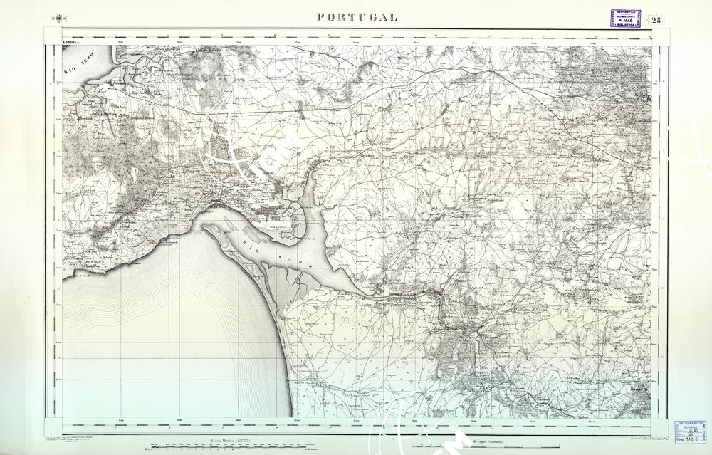 La carta si compone di 37 fogli; corrispondenti ad un’astensione di circa 4000 Kmq. Il rilievo del terreno per la sua compilazione fu dapprima eseguito alla scala di 1:100.000; in seguito per le regioni più popolate fu fatto al 50 mila. E’ stampata in nero da incisione su pietra. La configurazione del suolo era dapprima rappresentata col solo tratteggio, in seguito fu adottato per tutti i fogli il sistema delle curve di livello con equidistanza di 25 metri, sussidiato da quote altimetriche. Le curve sono molto sottili, è difficile quindi afferrare la precisa configurazione del terreno. Il reticolato geografico è formato sia con archi di circonferenza determinanti la longitudine e la latitudine in gradazione sessagesimale a partire dal meridiano di Lisbona, sia con linee rette determinanti una rete di quadrelateri aventi un’ampiezza di 5 Km. nel senso della latitudine e di 8 Km. in quello della longitudine. La scala oltrechè nel rapporto metrico è riprodotta anche in leghe. Direcçao Geral dos Trabalhos Geodesicos do Reino.