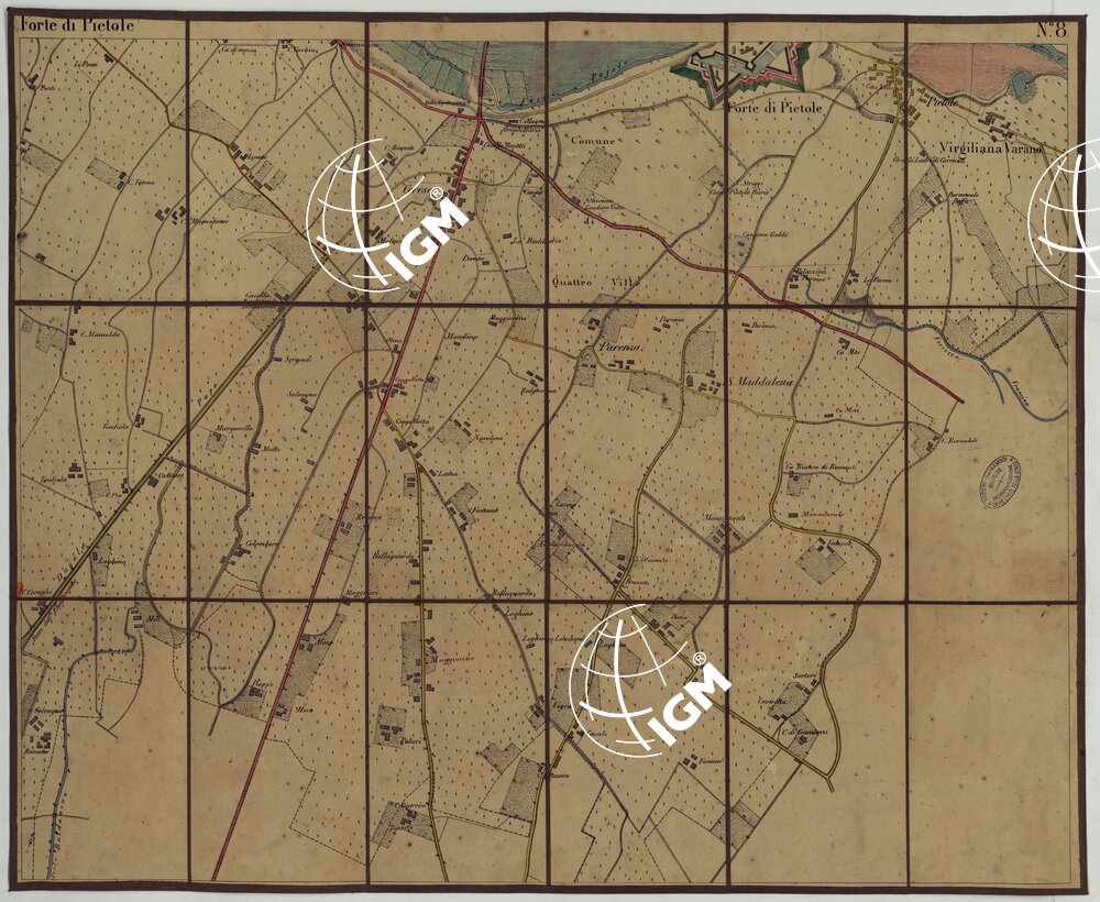 Carta in nove fogli in litografia, montati su tela a stacchi, supposta eseguita dall’Ufficio Tecnico Maggiore prima della campagna del 1866. Distingue con particolare dettaglio e a colori le strade e le opere fortificatorie; mostra le ferrovie in nero e così pure i vari tipi di colture. Le acque sono in azzurro. Il foglio N° 1 contiene l’elenco degli stabilimenti militari ed edifici vari di Mantova: il foglio N° 9 reca la legenda dei segni convenzionali.