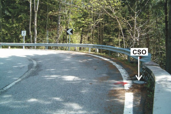 | Contrassegni | [{"simbolo_contrassegno":"P5","materializzazione":"(CSO) – Pozzetto di IV categoria rialzato con tubo in pvc e protetto da tappo in ghisa posto alla base del parapetto a valle, estremit\u00e0 verso la curva."}] |
