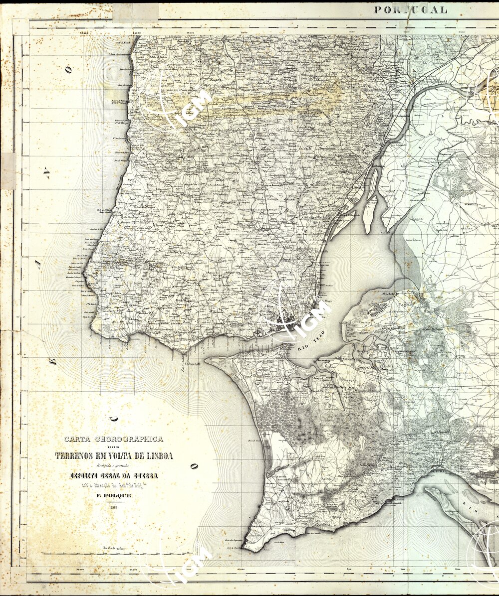 Deposito Geral da Guerra. E’ stampata in nero. compilata sotto la direzione del Gen. F. Folque, è stata costruita su proiezione piana rettangolare con centro di sviluppo Lisbona. I meridiani ed i paralleli sono tracciati con equidistanza di 8 Km. per i primi, e di 5 Km. per i secondi. Ai margini del foglio sono anche segnate le graduazioni sessagesimali di longitudine e di latitudine. L’orografia è rappresentata da curve di livello, con equidistanza di 25 metri, e con quote altimetriche segnate nei punti più caratteristici del terreno. Mentre è dato poco rilievo alla conformazione del terreno per l’esilità con cui sono tracciate le linee ipsometriche, è posto invece in evidenza tutto ciò che si riferisce alla parte planimetrica.