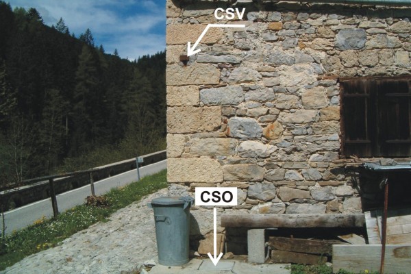 | Contrassegni | [{"simbolo_contrassegno":"P3","materializzazione":"(CSO) – Chiusino in ghisa di III categoria rialzato con tubo in pvc e protetto da coperchio in cemento posto alla base del fianco destro, spigolo di sinistra."},{"simbolo_contrassegno":"V1","materializzazione":"(CSV) – Mensola infissa sul fianco destro, spigolo di sinistra."}] |