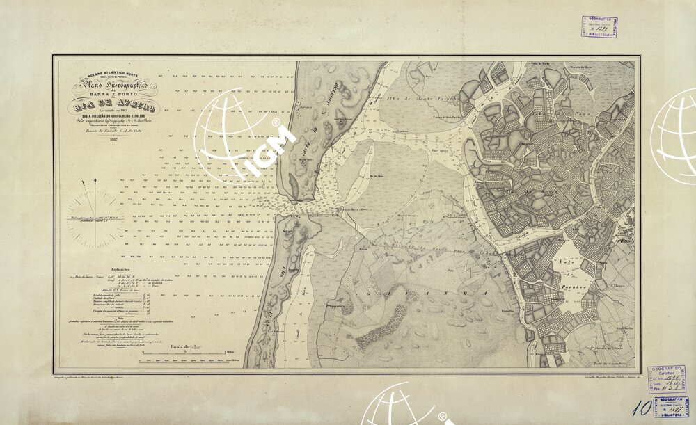 Lisboa – Direcçao Geral dos trabalhos geodesicos, 1887. E’stampata in nero da incisione su pietra. E’ riprodotta oltre che la costa una parte della zona interna e la città. Le quote dei sondaggi sono espresse in metri.