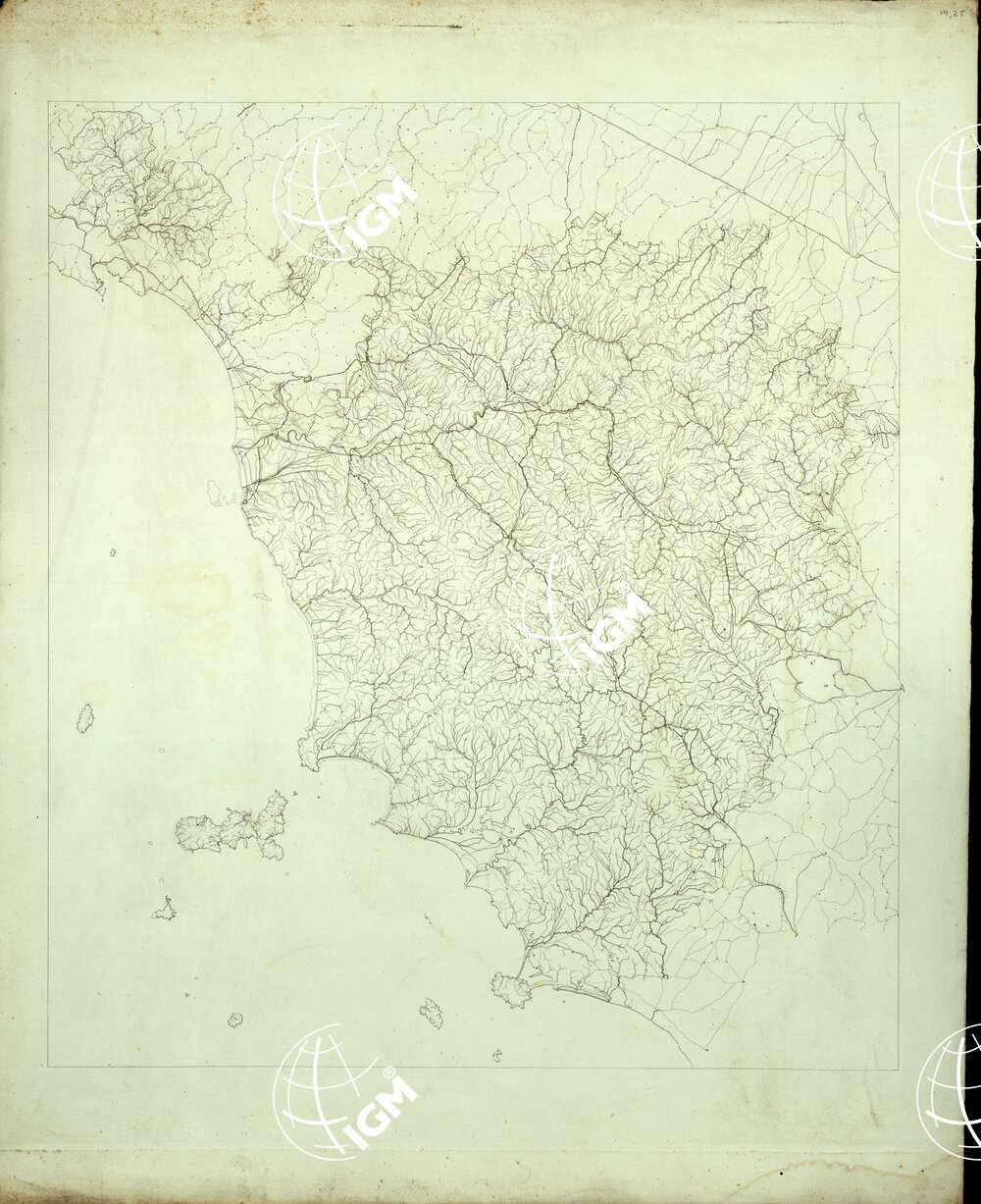 La riduzione è stata eseguita con eccellente Pantografo, sotto gli occhi e sull’originale inedito dall’autore e con l’appoggio di quasi tutti i di lui punti trigonometrici, che si è avuto cura di collocare con diligenza al rispettivo loro luogo prima di dar mano al lavoro. La carta preledato G. Inghirami è nella proporzione di 1:200 mila ed è stata costruita sopra una rete di 2505 triangoli di primo ordine; attestati a 767 punti trigonometrici. Le posizioni Geografiche sono dipendenti da quelle dell’osservatorio delle Scuole Pie di Firenze, a cui le più recenti osservazioni danno 43°46’41” Lat. Boreale e 8° 45′ 0″ Long. ceduta dalla Reale Specola di Parigi. L’orientamento è stato determinato con molte osservazioni D’Azimuth sui punti trigonometrici visibili del predetto osservatorio. La proiezione è quella Bonne; il meridiano medio cade sugli 8°59’50”, e il parallelo medio sui 43°0’0″.