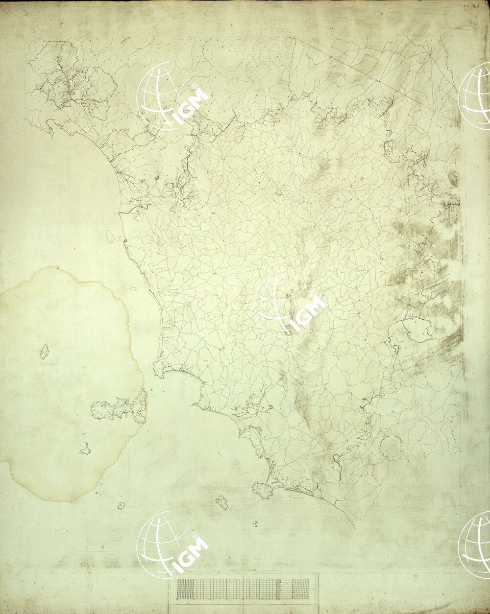 La riduzione è stata eseguita con eccellente Pantografo, sotto gli occhi e sull’originale inedito dell’autore e con l’appoggio di quasi tutti i di lui punti trigonometrici, che si è avuto cura di collocare con diligenza al rispettivo loro luogo prima di dar mano al lavoro. La carta prelodato G. Inghirami è nella proporzione di 1:200 mila ed è stata costruita sopra una rete di 2505 triangoli di primo ordine; attestati a 767 punti trigonometrici. Le posizioni Geografiche sono dipendenti da quelle dell’osservatorio delle Scuole Pie di Firenze, a cui le più recenti osservazioni danno 43°46’41” Lat. Boreale e 8° 45’0″ Long. ceduta dalla Reale Specola di Parigi. L’orientamento è stato determinato con molte osservazioni D’Azimuth sui punti trigonometrici visibili dal predetto osservatorio. La proiezione è quella Bonne; il meridiano medio cade sugli 8°59’50”, e il parallelo medio sui 43°0’0″.