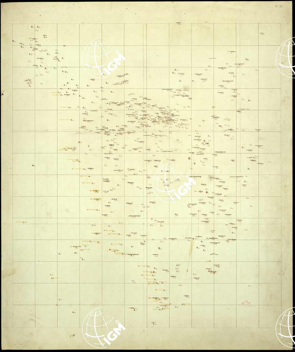 La riduzione è stata eseguita con eccellente Pantografo, sotto gli occhi e sull’originale inedito dell’autore e con l’appoggio di quasi tutti i di lui punti trigonometrici, che si è avuto cura di collocare con diligenza al rispettivo loro luogo prima di dar mano al lavoro. La carta prelodato G. Inghirami è nella proporzione di 1:200 mila ed è stata costruita sopra una rete di 2505 triangoli di primo ordine; attestati a 767 punti trigonometrici. Le posizioni Geografiche sono dipendenti da quelle dell’osservatorio delle Scuole Pie di Firenze, a cui le più recenti osservazioni danno 43°46’41” Lat Boreale e 8°45’0″ Long. ceduta dalle Reale Specola di Parigi. L’orientamento è stato determinato con molte osservazioni D’Azimuth sui punti trigonometrici visibili dal predetto osservatorio. La proiezione è quella Bonne; il meridiano medio code sugli 8°59’50”, e il parallelo medio sui 43°0’0″.