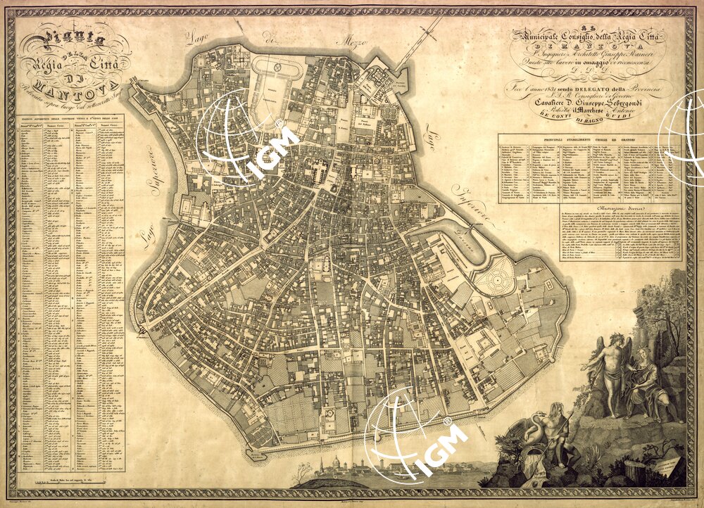 Municipale consiglio della Regia città di Mantova. L’ing. architetto Giuseppe Raineri questo suo lavoro in omaggio di riconoscenza. D. D. D. Fece l’anno 1831 sendo delegato della Provincia, l’I.R. Consigliere di Governo, Cavaliere D. Giuseppe Sebregondi e Podestà il Marchese Antonio de Conti di Bagno Guidi.