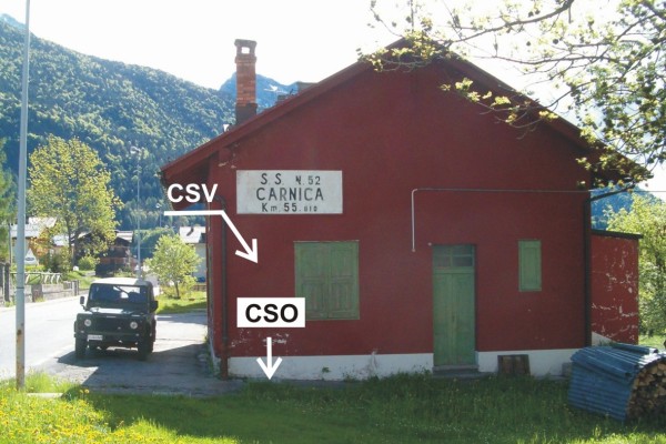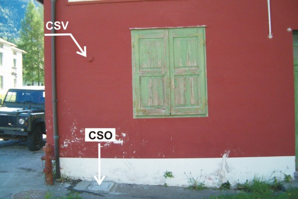 [{"simbolo_contrassegno":"P3","materializzazione":"(CSO) – Pozzetto di III categoria rialzato con coperchio in cemento e protetto da chiusino in cemento anonimo posto alla base del fianco destro dell'edificio, spigolo di sinistra."},{"simbolo_contrassegno":"V1","materializzazione":"(CSV) – Mensola infissa sul fianco destro della Cantoniera, spigolo di sinistra."}]