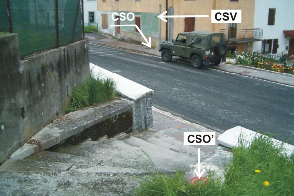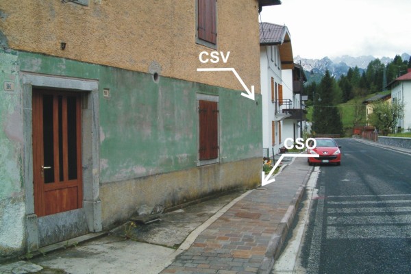 [{"simbolo_contrassegno":"P3","materializzazione":"(CSO) – Chiusino in ghisa di III categoria posto alla base della facciata, presso lo spigolo di destra."},{"simbolo_contrassegno":"V1","materializzazione":"(CSV) – Mensola posta sulla facciata dell'abitazione."},{"simbolo_contrassegno":"B7","materializzazione":"(CSO'') – Centrino piatto in acciaio inox della rete GPS della Regione Friuli Venezia Giulia, infisso sul muretto della scala in corrispondenza dell'ultimo gradino ed a destra salendo."}]