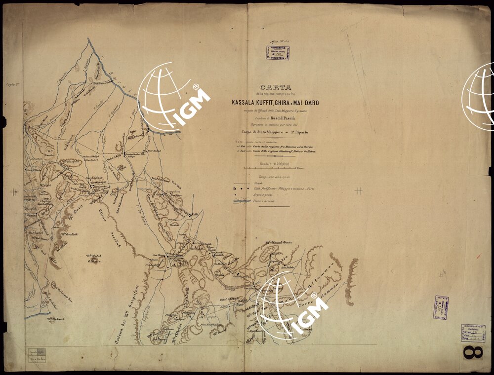 Eseguita da uficiali dello Stato Maggiore Egiziano d’ordine di Rascid Pascià riprodotta in italiano per cura del corpo di Stato Maggiore. 1° Reparto (1888). La carta consta di quattro fogli a stampa policroma. L’orografia è rappresentata dimostrativamente con curve di livello e tratteggio, l’idrografia in azzurro, le scritture, strade e centri abitati in nero. Riproduzione in fotolitografia. La carta si riattacca a sud con la carta delle regioni Ghedaref, Daka e Gallabat (ved. N°797 d’inventario) aklla stessa scala a est con la carta delle regioni fra Massaua e il Barka.